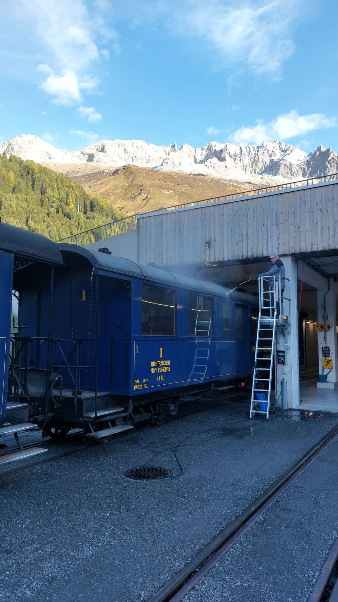 Zo worden de rijtuigen grondig gewassen en in de winterstalling in Realp geplaatst. Maar ook wordt er doorgewerkt in de werkplaats Aarau aan de revisie van de rijtuigen.