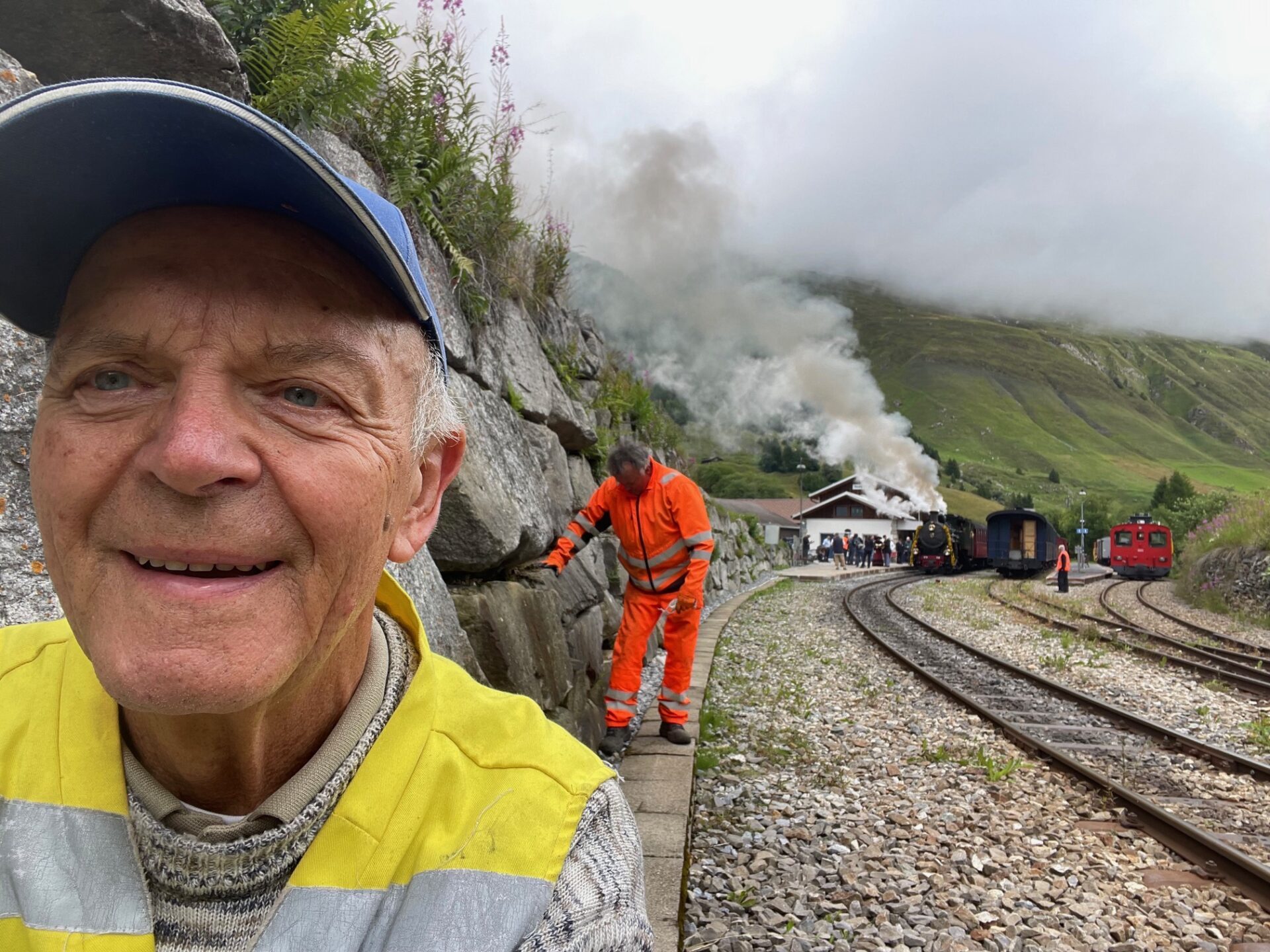 Overeenkomstig de veiligheidsvoorschriften begroetten we de machinist met een stramme hand omhoog, waarna we wuivend de begroeting van de passagiers in ontvangst namen. Wij hadden een fijne dag met op tijd koffie , thee en de onovertroffen Realp cake. Onze werkweek zit er bijna op.