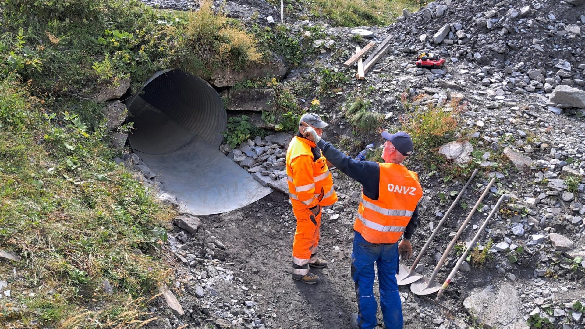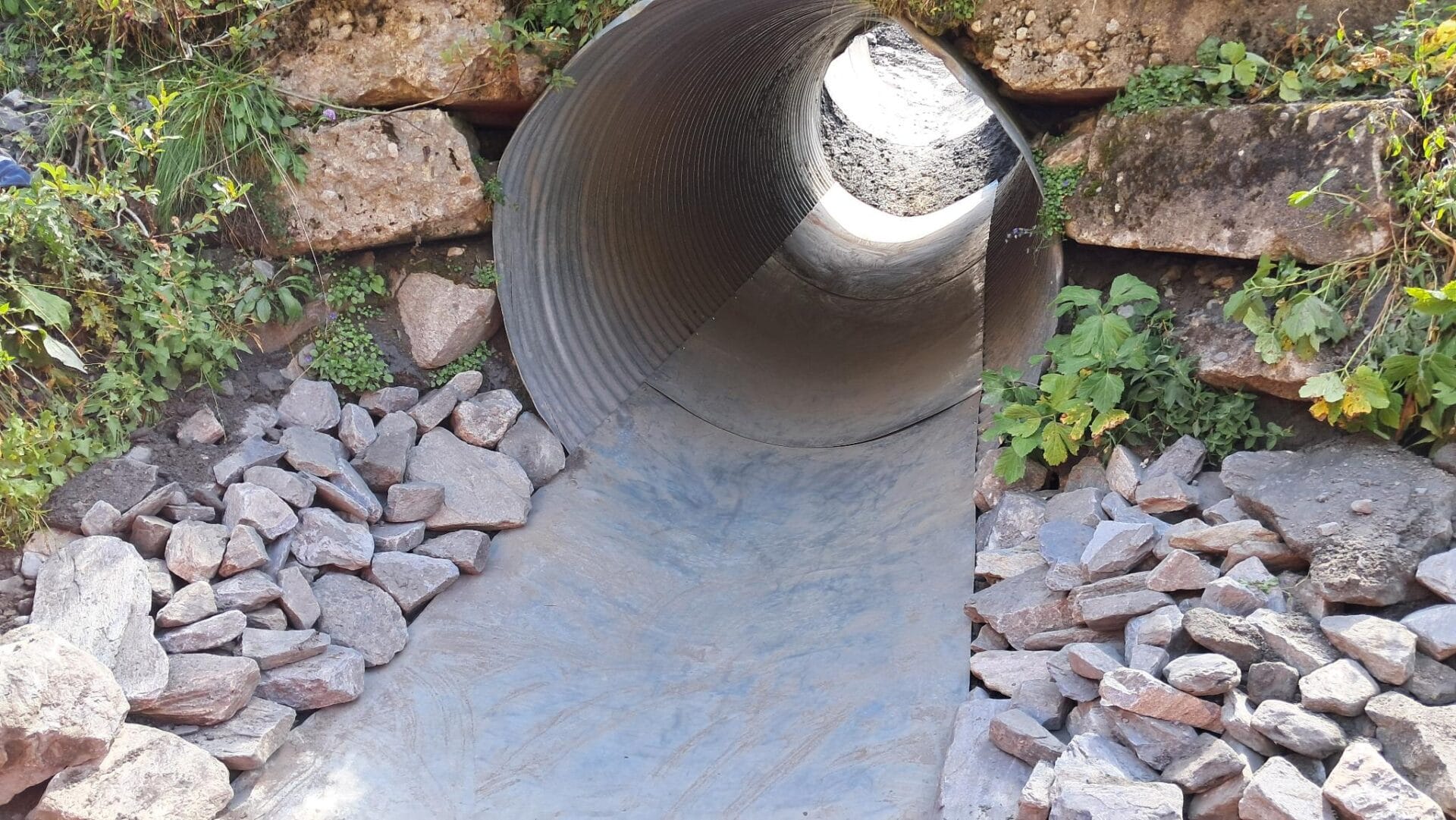 Christoph heeft donderdagmiddag geconstateerd dat de duiker mooi is leeggespoeld. Daar worden nu op de geribbelde duiker stalen platen vastgemaakt, zodat water en stenen minder weerstand hebben en hopelijk makkelijker door de buis schuiven en rollen.